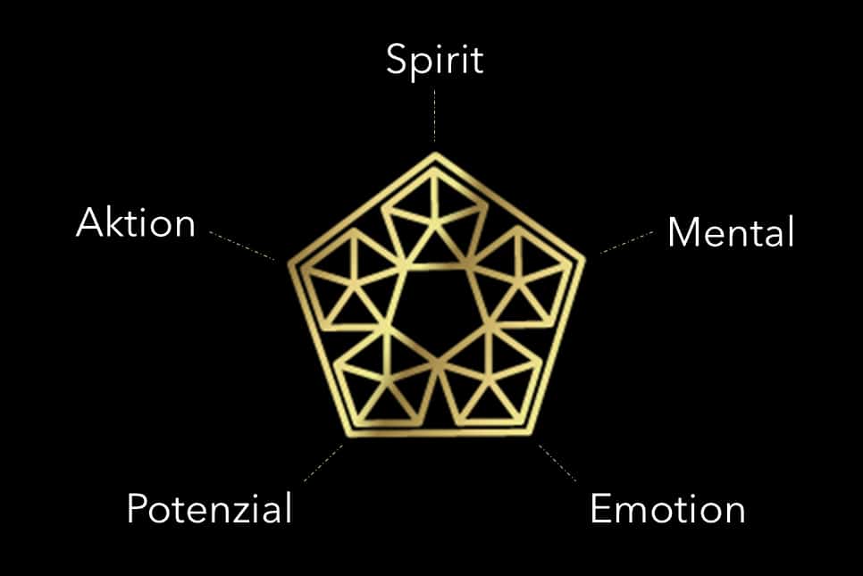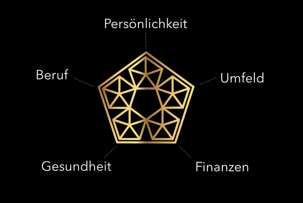 Der Lebensstern besteht aus fünf Lebensbereichen, die es zu optimieren gilt. Wenn Du an diesen Elementen arbeitest, erhältst Du genau die Lebensqualität äußerlich aber auch innerlich, die Du haben willst. Diese fünf Lebensbereiche machen Deine Lebensqualität, Dein Glück aus.